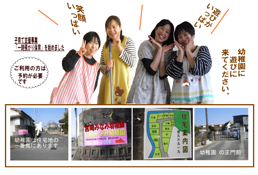 園長あいさつ 宮崎みなみ幼稚園は小規模の幼稚園です。住宅地の中にあり、近隣の方たちとの関わりがもてる環境で子どもたちの元気な挨拶や笑い声が絶えない幼稚園です。園庭には、食育への取り組みとして種まき・苗植えから育て収穫するという直接体験ができる「ちびっこ農園」があり、季節の野菜を育てることにより、その野菜の成長を知るとともに、食べ物や食の大切さや生きることの大切を肌で感じながら実体験を通して学んでいます。また、体力向上の目的として毎日の習慣として運動遊びを通して体力づくりに励んでいます。